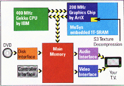 MoSys MoSys' patented 1T-SRAM technology is used in Dolphin to embed large, very high performance memory directly onto the ArtX graphics chip. It eliminates the transmission times between memory and chip. Gamers can expect more detailed graphics moving at higher framerates. |
